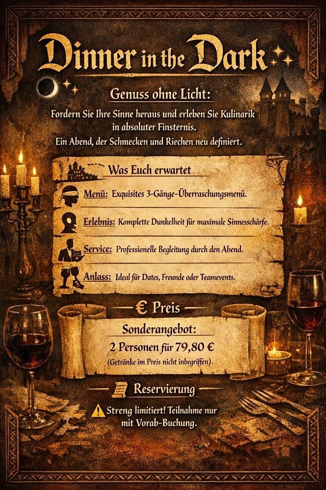 Erleben Sie in Thorheim ein außergewöhnliches Event, das Ihre Sinne auf völlig neue Weise herausfordert. Tauchen Sie ein in die absolute Dunkelheit und entdecken Sie, wie intensiv Schmecken, Riechen und Tasten sein können, wenn das Auge Pause macht.